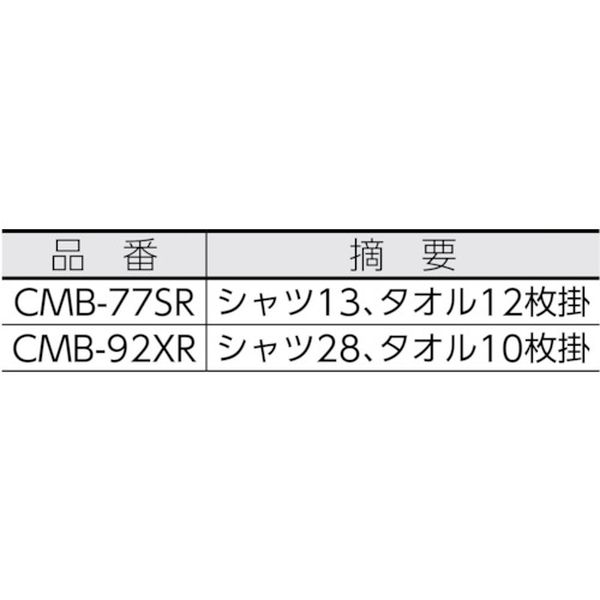 ・幅(mm):920〜1620・奥行(mm):640・高さ(mm):1275・摘要:シャツ28、タオル10枚掛・耐荷重:約12kg・3〜5人用・ステンレス巻きスチールパイプ、ポリプロピレン、ABS樹脂・生産国 中国・JANコード 4905009400614・質量 3.64kgCMB-92XR楽天 HD店